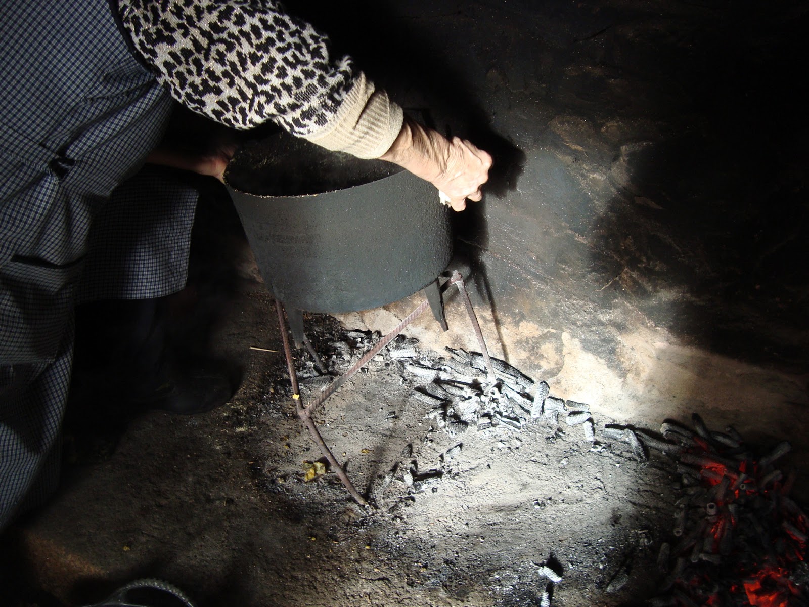 Pomos na lareira un pote enriba dun trespés. Metémolle debaixo uns